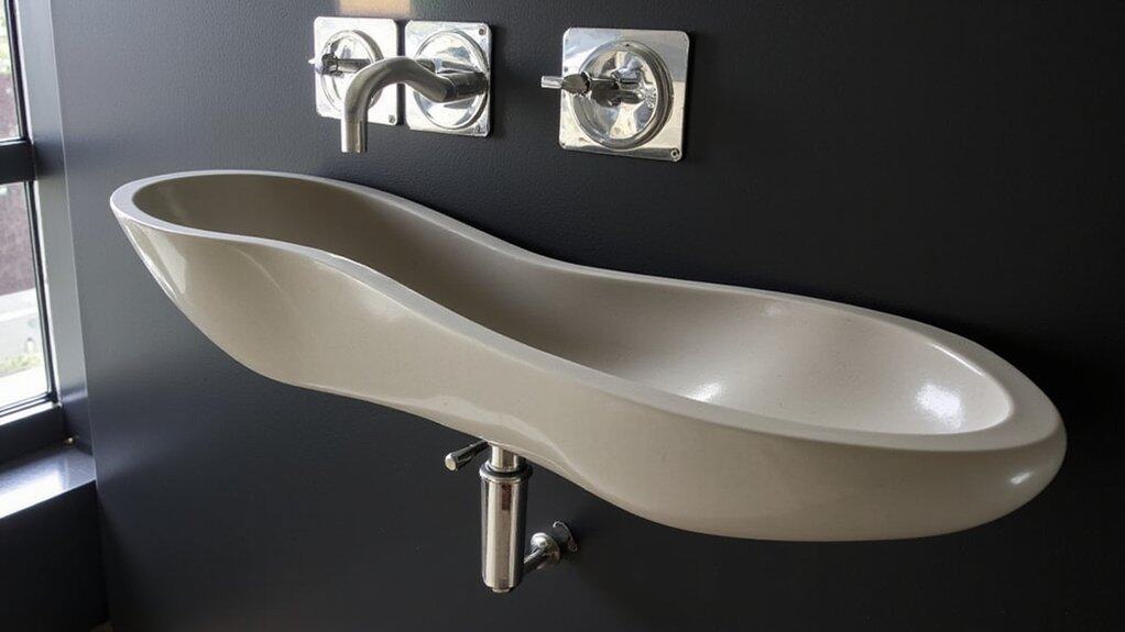 Moving from the elegance of onyx, let’s explore another striking option with a sculpted concrete sink for your powder room. You’re choosing a bold, industrial vibe with this 24-inch wide, 18-inch deep basin that’ll transform your space instantly.