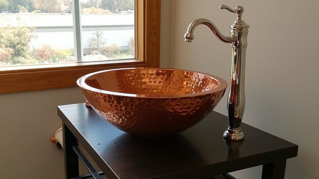 If you’re looking to add a distinctive touch to your powder room, opt for a unique copper sink. It’s a standout piece that brings warmth with its reddish-brown patina, transforming over time. You’ll love how it fits a 24-inch vanity, perfect for small spaces.