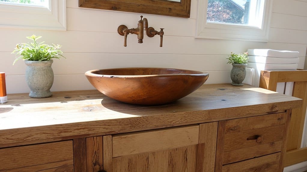 Imagine a unique twist in your powder room with a rustic wooden sink as the focal point. You’re creating a cozy, natural vibe with a handcrafted piece that’s roughly 24 inches wide and 18 inches deep, perfect for small spaces. Installation takes about 2 hours with basic tools.