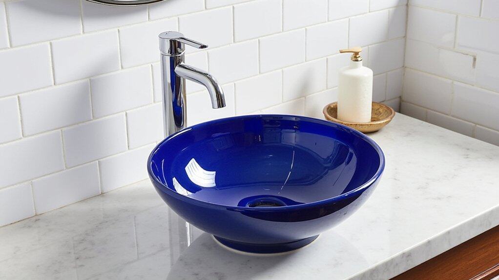 While transforming your powder room, consider a vivid cobalt sink to make a bold statement with vibrant color. This striking blue hue instantly grabs attention and elevates a small space. You can install a 16-inch wide, 12-inch deep ceramic basin in just a weekend with basic tools.