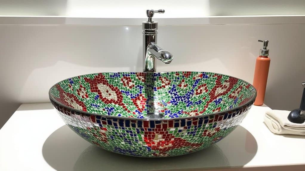 Transform your powder room with a vibrant mosaic sink that instantly grabs attention as a stunning centerpiece. You’re creating a bold statement when you install this eye-catching piece, typically 18-20 inches wide, fitting most vanities. Here’s how to enhance its impact: