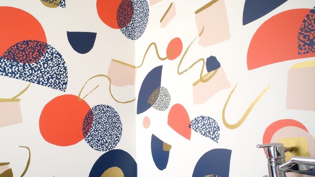 While whimsical animal motifs add charm, let’s shift to bold abstract artistry for a modern punch in your powder room. You’ll transform this small space with dynamic, non-figurative designs that intrigue guests. Opt for oversized prints, roughly 24 by 36 inches, and install within a weekend.
