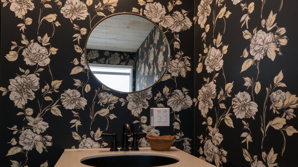 Take a look at striking floral wallpaper to transform your powder room into a bold statement space in just a weekend. You can cover a 5×7-foot wall in about 6 hours with the right tools. Start by measuring your walls precisely to buy enough rolls, typically 2-3 for a small room.