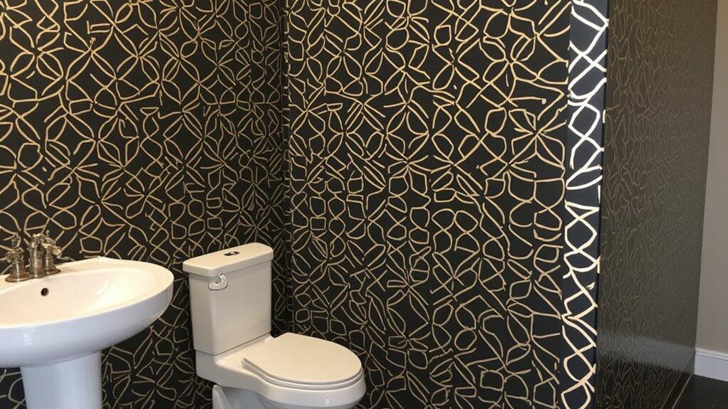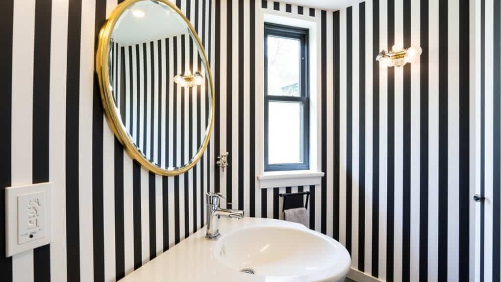 As you explore bold wallpaper options, consider chic monochrome stripes to give your powder room a sleek, timeless look. These stripes, in black and white, create a crisp vibe. Install them on a 5×7-foot accent wall for impact; it takes about 4 hours.