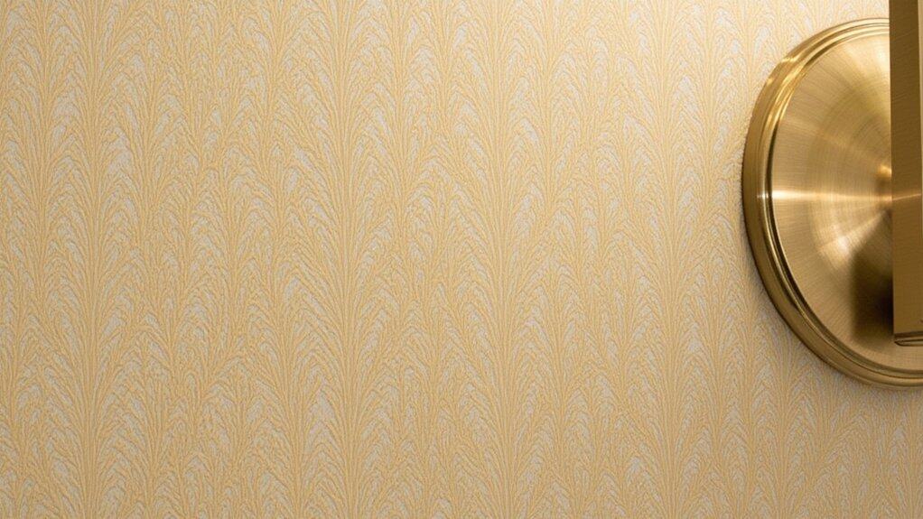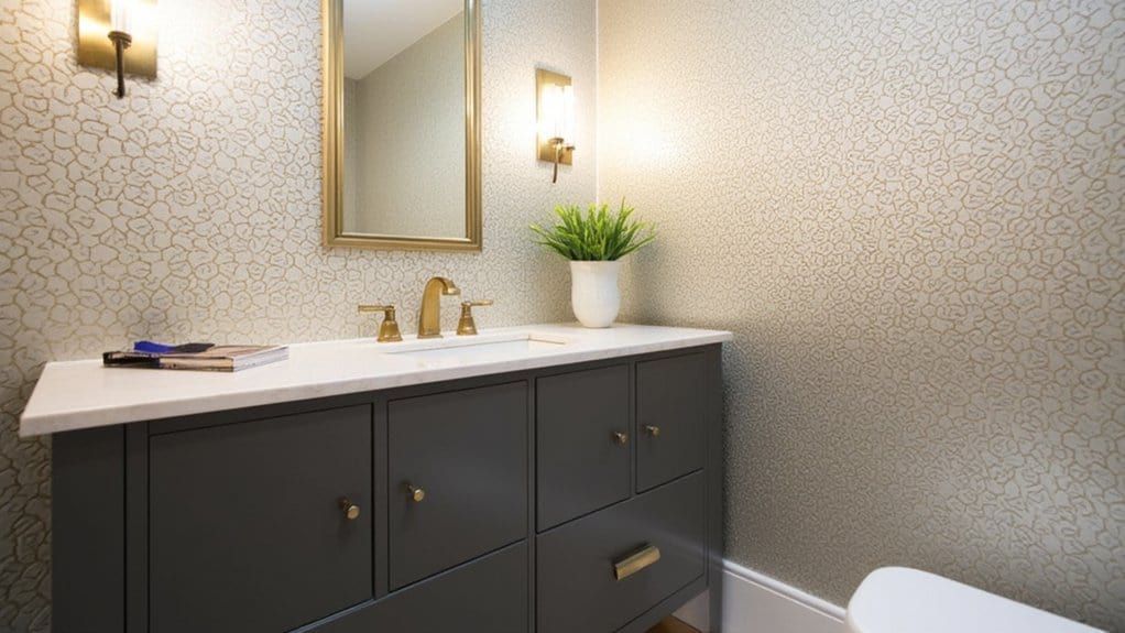 Moving from the lush, natural appeal of tropical prints, let’s explore the sleek sophistication of metallic accent wallpaper for your powder room. You’ll transform a small space into a glamorous retreat with shimmering tones. Choose a design with gold or silver accents to catch the light.