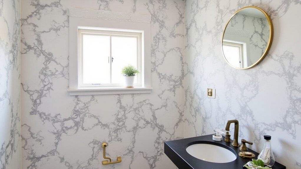 Switching to a luxurious marble effect wallpaper can transform your powder room into a high-end retreat with minimal effort. You’ll love how this design mimics real marble, adding elegance to a small 5×7-foot space. Install it over a weekend, taking about 6-8 hours, for a quick update.