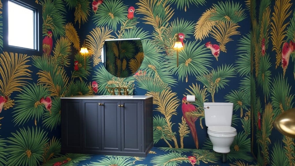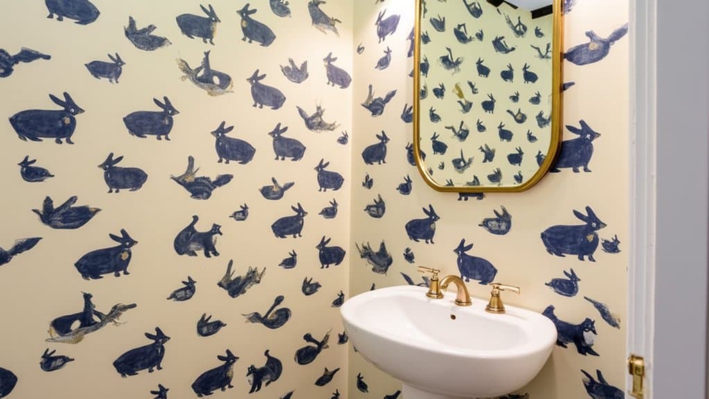 Imagine transforming your powder room with whimsical animal motifs that bring a playful yet stylish vibe. These designs, featuring quirky birds or frolicking foxes, can turn a small 5×7-foot space into a charming escape. You’ll want to choose a wallpaper with bold, hand-drawn details for instant impact.