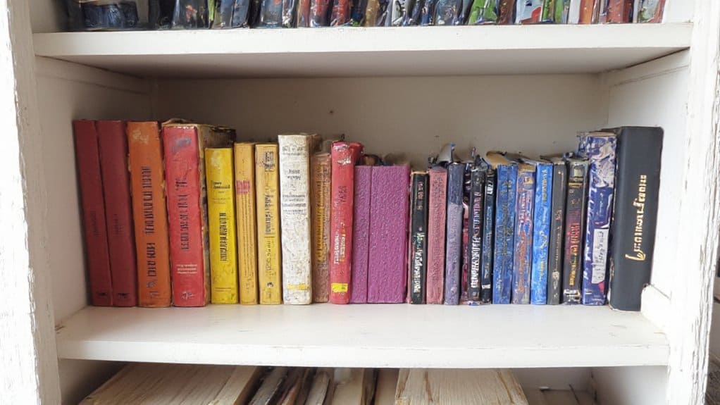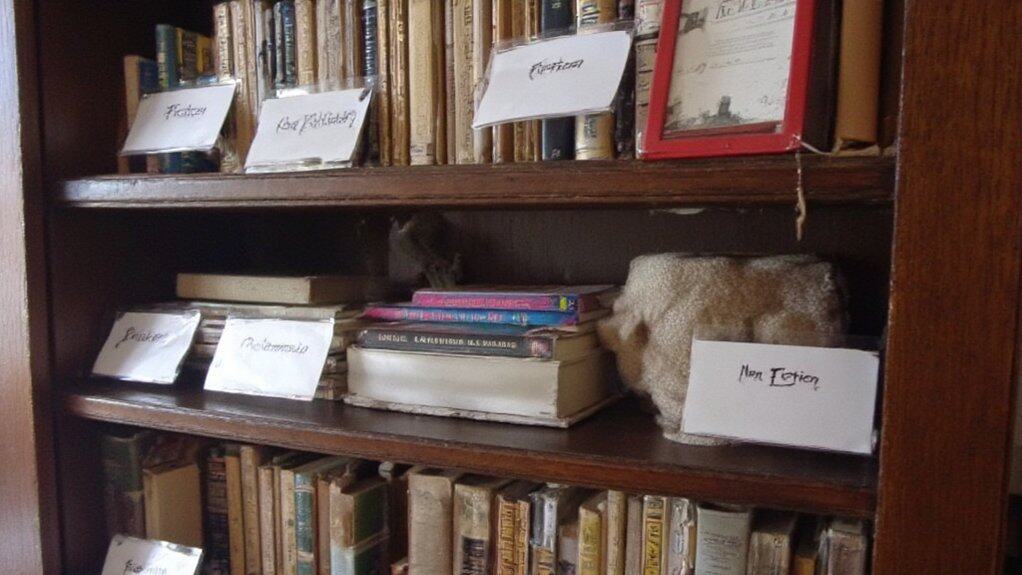 This method not only adds a decorative touch but also streamlines the process of finding books quickly. Guarantee consistency by sticking to your chosen color scheme and updating labels when adding new books to your collection. If you have a shared bookshelf, communicate the color system with others to maintain organization over time.