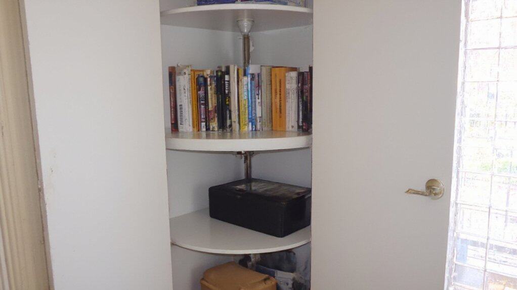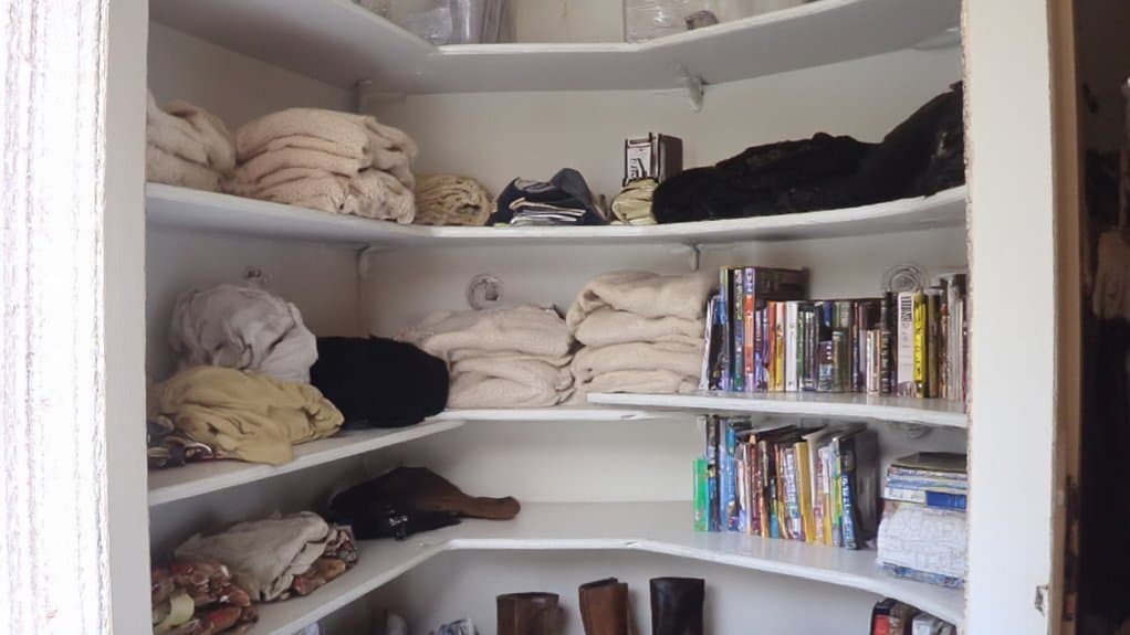Installing rotating corner shelves in a bookshelf closet is a smart way to maximize space in tight or awkwardly shaped areas. These shelves, also known as lazy Susans for closets, allow easy access to items stored in corners that are often hard to reach. Begin by measuring the corner space carefully to guarantee the rotating shelf unit fits perfectly, and choose a sturdy model that can support the weight of your books or other stored items.
