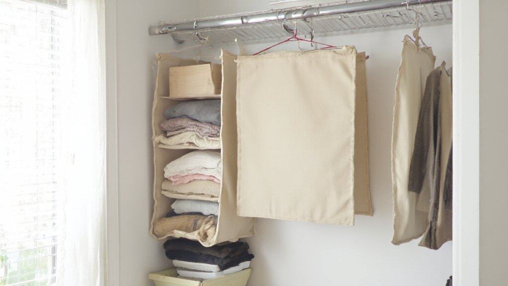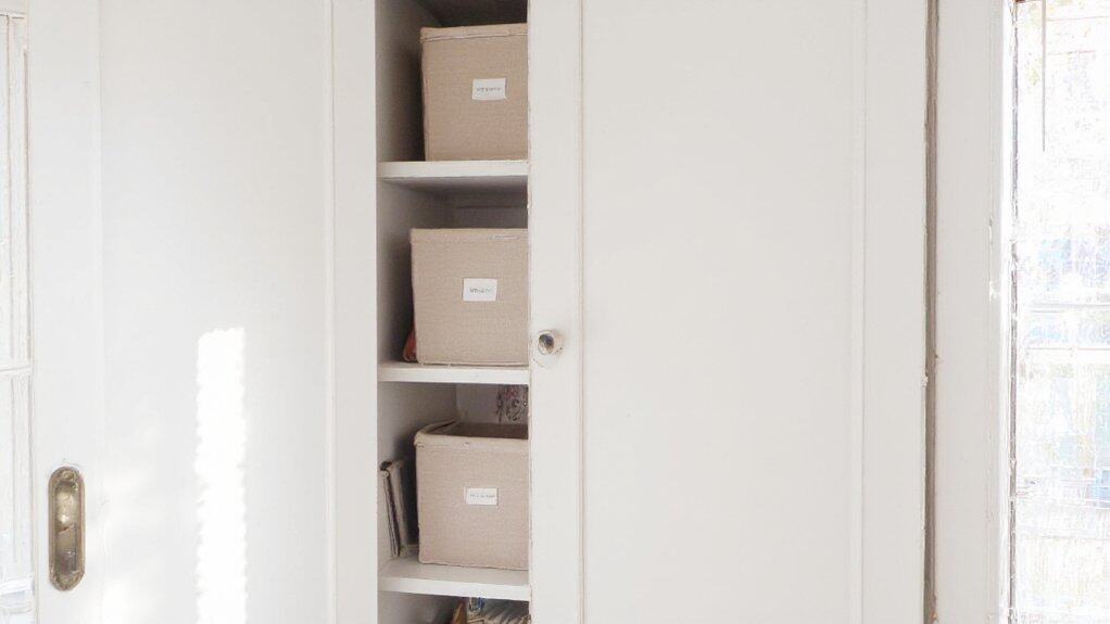 To create a visually appealing and functional setup, consider using shelf dividers to separate categories and prevent stacks from toppling over. Incorporate decorative boxes or baskets to hide clutter and add a cohesive look to the closet while maintaining easy access to contents. Label each section or container to guarantee everything has a designated spot, making it simple to maintain order over time.