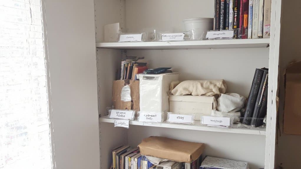 Magnetic shelf labels are a fantastic tool for keeping your bookshelf closet organized and easy to navigate. Start by purchasing a set of magnetic labels or creating your own using magnetic strips and printable labels or handwritten tags. Attach these labels to the edges of your shelves to clearly mark categories like fiction, non-fiction, or specific genres, guaranteeing you can quickly locate or return books to their designated spots.