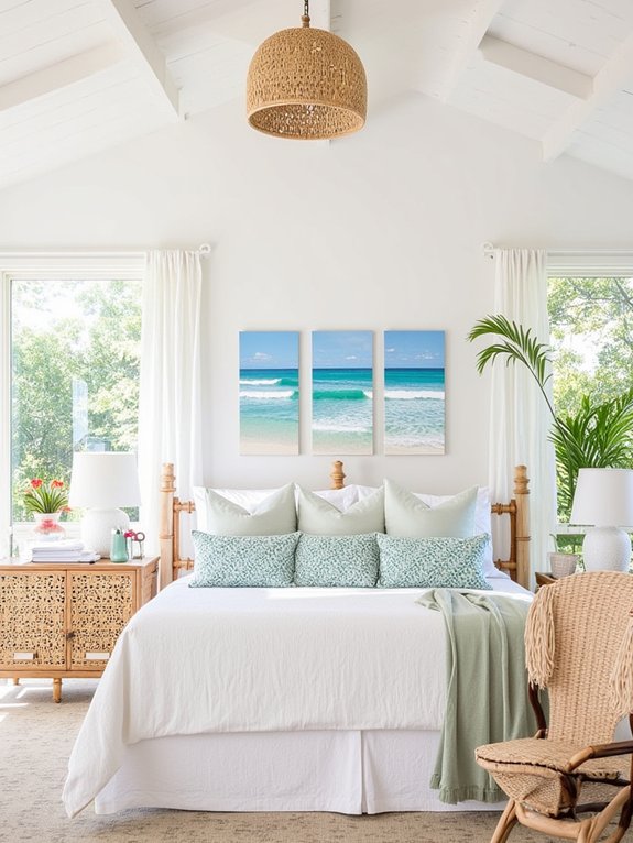 Beach prints above the bed create a stunning focal point in tropical-themed bedrooms. Large-format photographs or canvas prints featuring ocean waves, sandy shores, and palm-lined beaches can instantly transform the space while enhancing its coastal aesthetic.