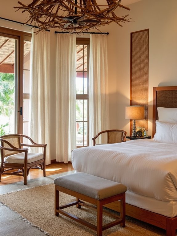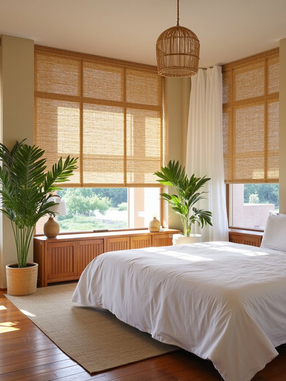 Woven grass window shades provide an elegant solution for tropical bedroom decor, combining practical light control with natural aesthetics. These window coverings filter sunlight while ensuring privacy, and their organic textures create visual interest in any space.