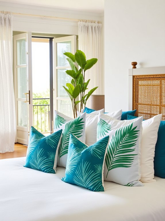Create a lush tropical bedroom setting with carefully selected silk throw pillows featuring vibrant monstera leaves, hibiscus flowers, and palm frond patterns. Mix these botanical designs with solid-colored silk pillows in sunset oranges, ocean blues, and leafy greens for visual contrast and depth.