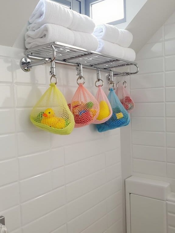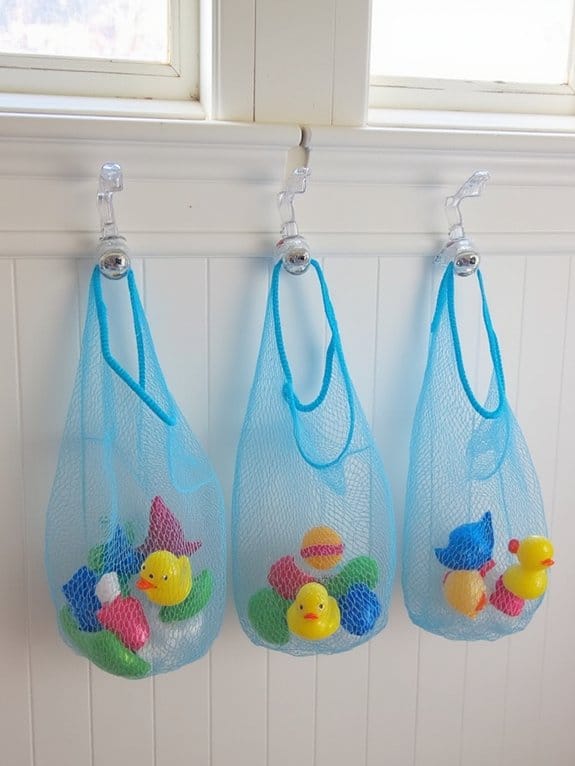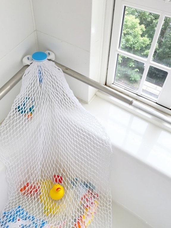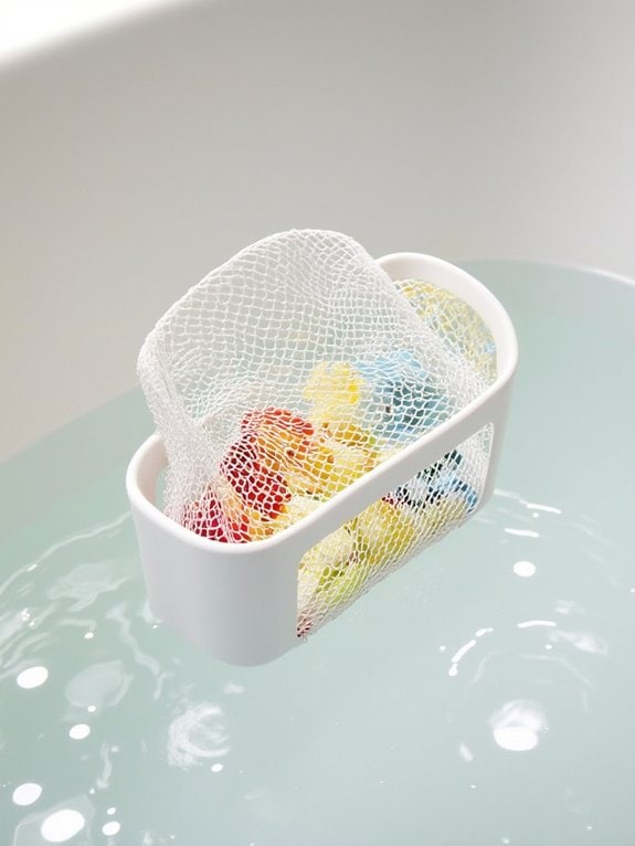 Mesh toy nets provide an efficient storage solution for bath toys, combining organization with proper ventilation. The quick-dry mesh material prevents mold while strong suction cups secure the net to shower walls, supporting up to 5 pounds of toys.