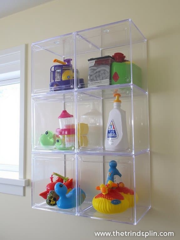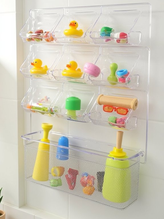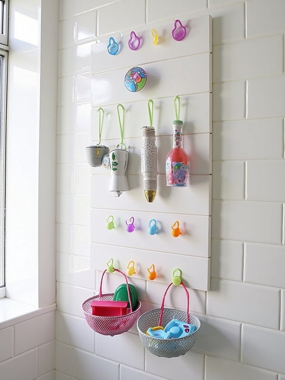 The pegboard setup maximizes vertical wall space while keeping toys easily accessible and well-ventilated. Clear containers allow quick identification of items, while strategic placement at adult height ensures safety. This organized approach prevents clutter around the tub and helps avoid common issues like mold growth in bath toy storage.