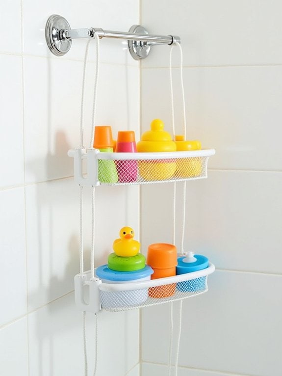 Each shelf tier accommodates up to 15 bath toys and features adjustable height settings to grow with children. This design maximizes bathroom functionality while keeping bath items organized and easily accessible, making it ideal for families seeking efficient storage options in limited spaces.