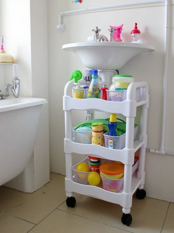 An under-sink storage cart provides a practical solution for organizing bathroom supplies and bath toys while maximizing often-unused space. This mobile unit fits neatly beneath the sink and can be rolled out when needed, keeping items accessible yet concealed.