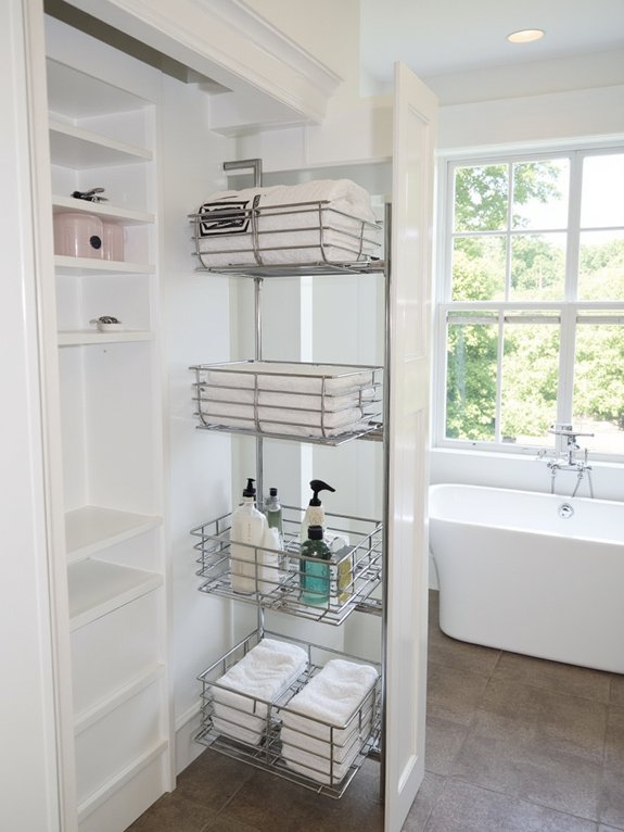 Pull-out storage rails transform cramped bathroom closets into organized, accessible spaces. By mounting rails at different heights, you can create a customized storage system that keeps items neatly arranged and easy to reach, even at the back of deep shelves.