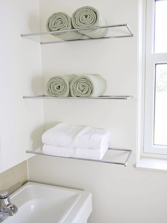 Installing durable, moisture-resistant materials like chrome-plated, stainless steel, or aluminum racks ensures longevity in humid bathroom environments. Multiple-tier options accommodate different towel sizes, while proper measurements and door clearance considerations prevent interference with daily bathroom activities.