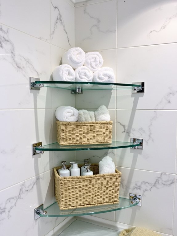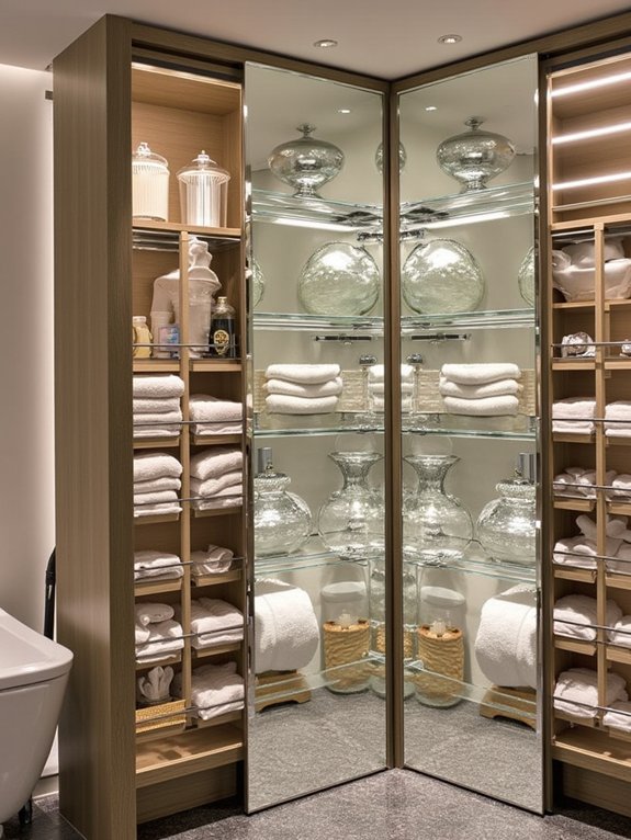 Revolving corner shelves transform unused bathroom closet spaces into efficient storage areas. These innovative solutions feature rotating platforms that maximize corner accessibility while providing organized storage for various items.