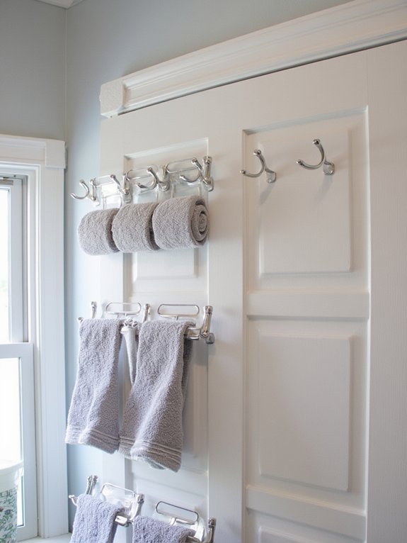 To get the most benefit, choose sturdy hooks rated for at least 10 pounds each, with protective padding to prevent door damage. Double-sided options allow you to use both sides of the door, while rust-resistant materials like brushed nickel or chrome ensure long-lasting functionality. The hooks keep towels, robes, and clothing easily accessible while utilizing otherwise unused space.