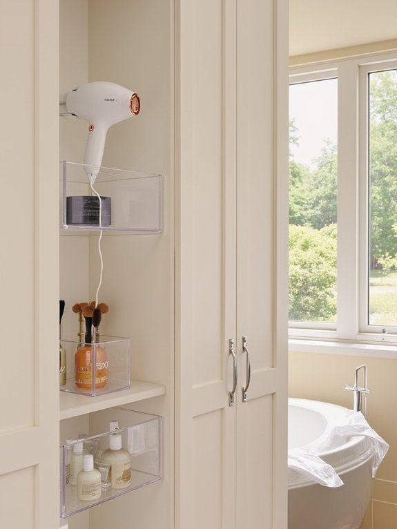 Over-door storage hooks offer a simple solution to maximize vertical space in your bathroom closet without permanent modifications. These hooks can be quickly installed and removed, making them ideal for renters or those wanting flexible storage options.