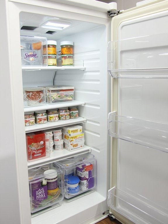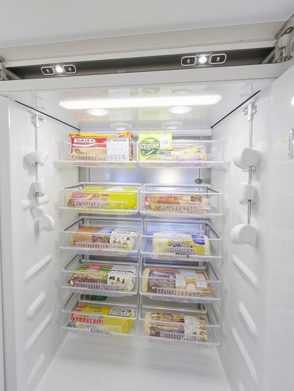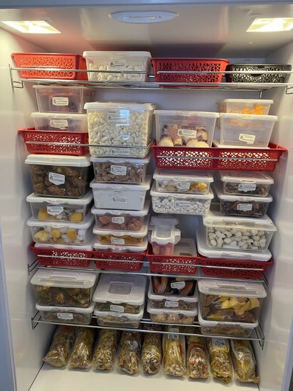 The system utilizes removable wire baskets that hook onto the dividers for smaller items, while a labeling system helps track frozen inventory. This structured approach prevents food from getting buried at the bottom of the freezer and maintains easy access to all stored items, maximizing the freezer’s storage capacity.