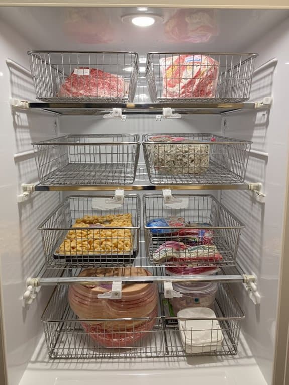 The system allows for strategic placement of items based on frequency of use and size. Smaller baskets positioned near the top provide easy access to commonly needed items, while larger baskets placed lower accommodate bulkier frozen goods. This configuration maximizes storage capacity while maintaining efficient organization within the freezer.