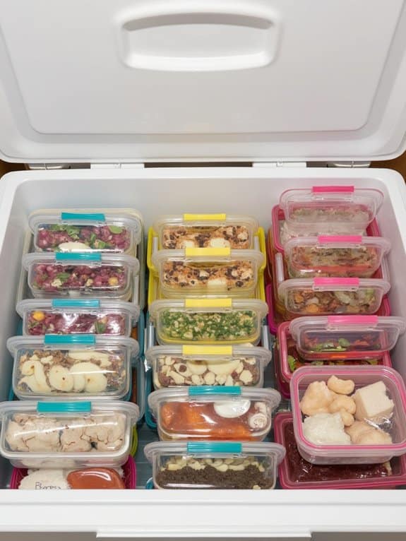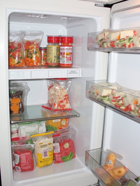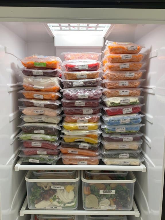 The system uses waterproof labels to identify each section while allowing easy access to frozen items by sliding bags sideways instead of digging through stacked contents. This vertical arrangement maximizes freezer capacity and keeps all items visible and readily accessible.