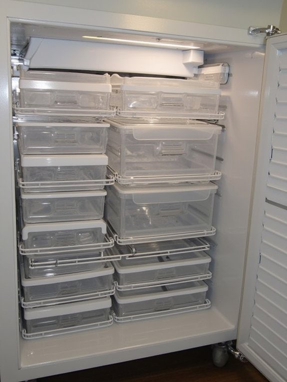 The system requires mounting drawer tracks at regular intervals, fitting appropriately-sized drawers with adequate clearance, and adding dividers to create organized compartments. Waterproof labels and handles enhance functionality, making it simple to locate and retrieve frozen items without rummaging through layers of food.