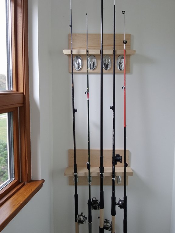 A rod hook storage shelf efficiently combines vertical rod organization with convenient shelf space above. By mounting heavy-duty hooks on the wall and adding a top shelf, anglers can keep their fishing equipment organized while maximizing available space.