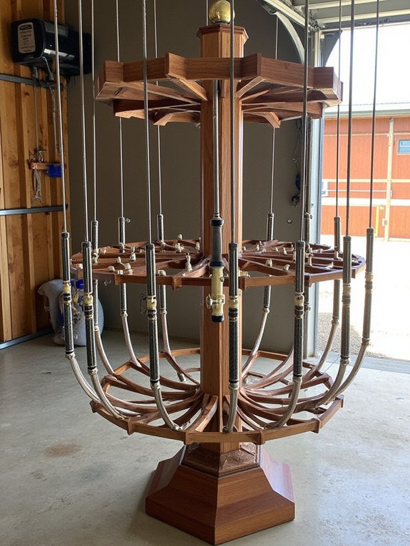 The stand features smooth-operating ball bearings and can accommodate 12-24 rods depending on size. Its vertical design maximizes garage space utilization, while adjustable, rubber-lined holders protect various rod sizes from damage. The rotating mechanism enables quick selection of specific rods without disturbing the rest of the collection.