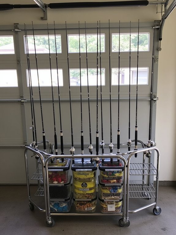 The weather-resistant design includes powder coating to prevent rust, while the 24-inch width ensures easy movement through standard doorways. This portable system transforms traditional storage methods by allowing anglers to roll their equipment wherever needed, combining accessibility with practical organization.