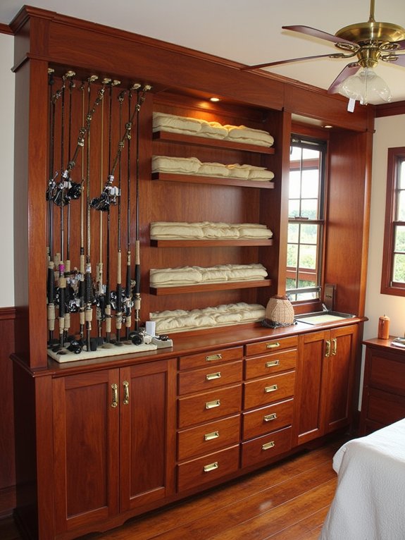 A rod storage cabinet system provides a structured solution for organizing and protecting fishing equipment. The system features adjustable shelving, foam-padded surfaces, and dedicated compartments to safely store rods, reels, and tackle in a space-efficient manner.