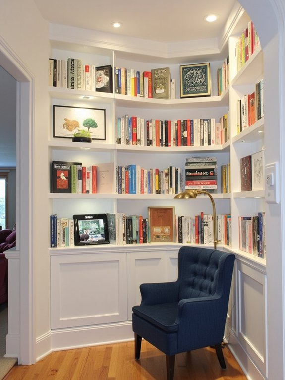 Complete the nook with a cushioned bench featuring hidden storage for cozy accessories, and incorporate space-saving LED shelf lighting to illuminate your collection. This efficient design creates a dedicated reading retreat that makes the most of limited square footage while providing an organized home for your books.