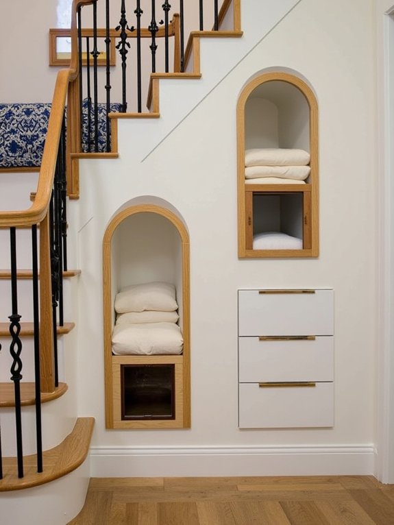 A multi-level pet hideaway beneath the staircase transforms unused space into a cozy retreat for pets. By installing cushioned platforms at different heights, adding ventilation holes, and including removable bedding areas, this creative design maximizes vertical space while providing comfort and functionality.