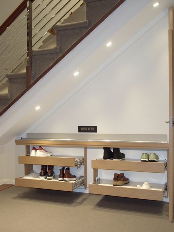 Built-in shoe storage beneath stairs offers an efficient solution for organizing footwear while keeping entryways tidy. Under-stair shoe racks maximize vertical space utilization while ensuring shoes remain easily accessible and well-organized.