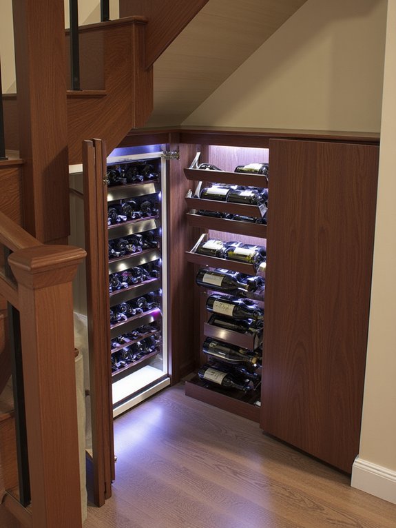 A sliding wine rack system installed beneath the staircase converts unused space into sophisticated bottle storage. The three pull-out racks accommodate up to 36 bottles while maintaining proper storage angles and easy accessibility.
