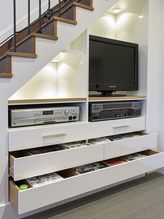 The design features pullout drawers for media storage and a sliding panel system that keeps everything hidden when not in use. With proper cable management and strategic organization, this under-stairs space maximizes storage potential while preserving the room’s clean aesthetic.