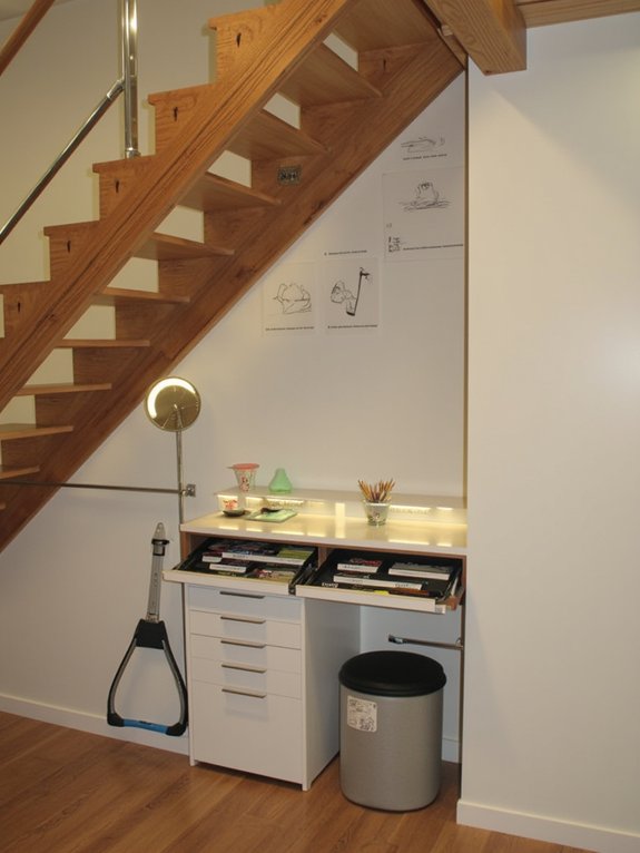 A crafting supply organizer beneath the stairs turns unused space into a practical storage solution for hobby materials. Installing adjustable shelves, pull-out drawers, and pegboards creates an organized system that keeps supplies accessible and visible.
