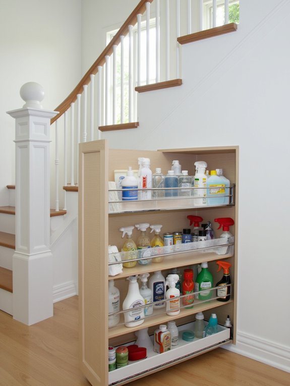 A pull-out cleaning supply cabinet beneath the stairs transforms unused space into practical storage. This custom solution incorporates smooth-gliding rails and adjustable shelving to accommodate various cleaning products while keeping them organized and easily accessible.