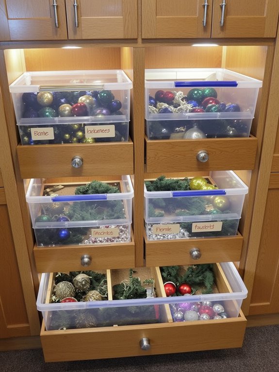 Create an efficient system using labeled bins for different holidays, pullout drawers with dividers for delicate items, and moisture-resistant containers for outdoor decorations. Add cedar blocks to prevent moisture damage and pest problems. This organized approach ensures your holiday items remain in good condition and are easily accessible when needed.