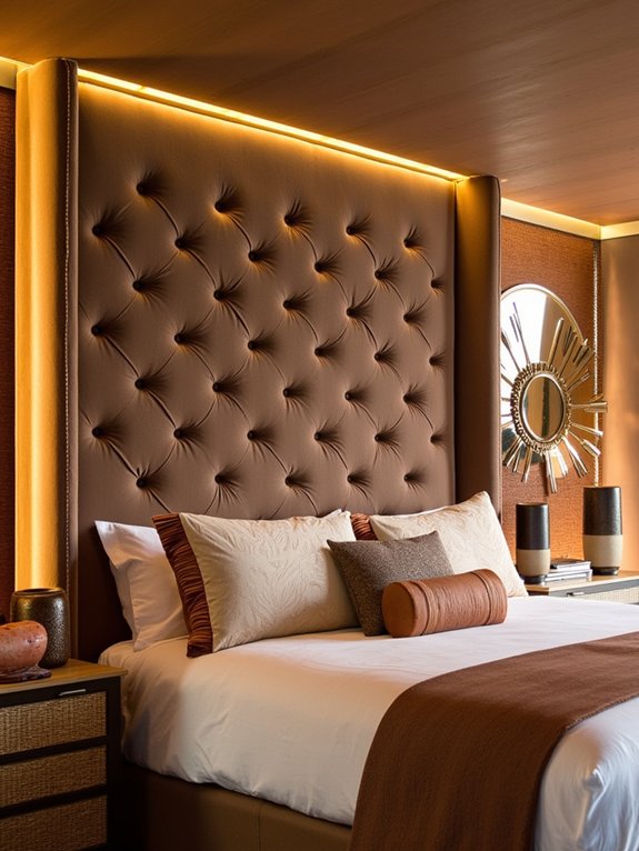 Brown suede padded headboards serve as luxurious bedroom centerpieces, combining visual appeal with practical comfort. The rich suede material creates an elegant focal point while providing a soft, cushioned surface perfect for reading or watching TV in bed.