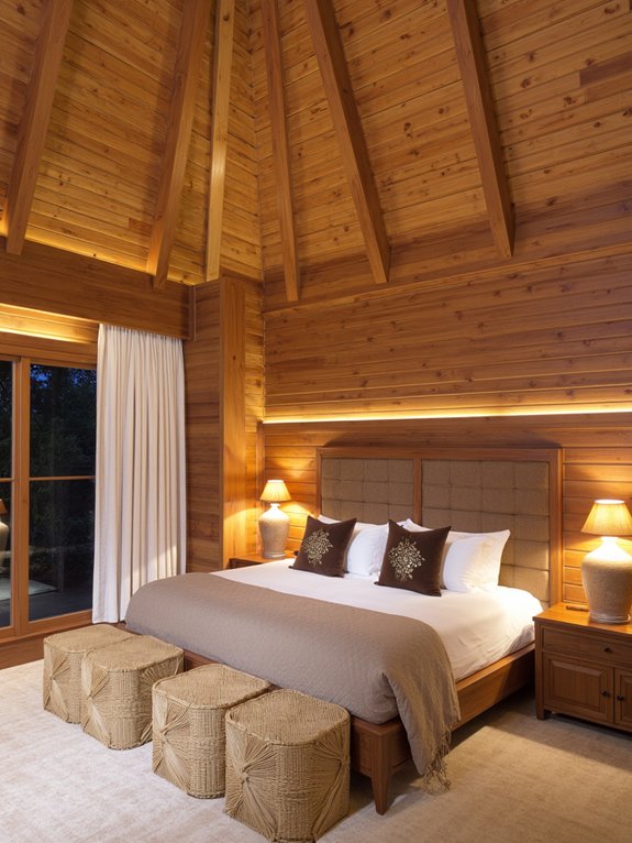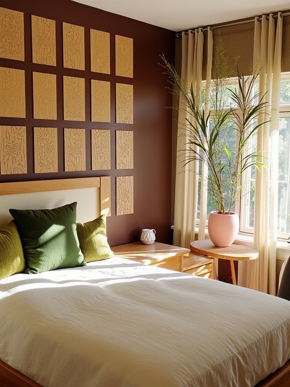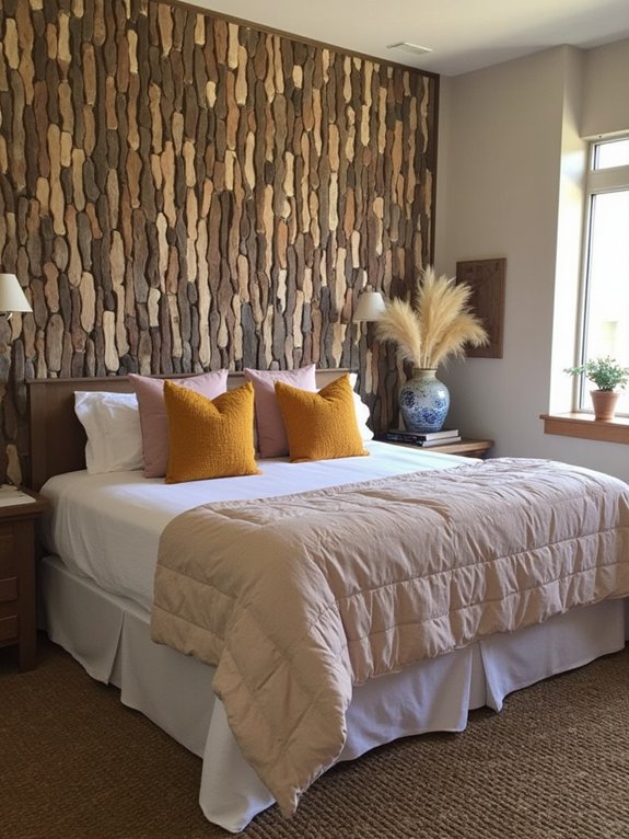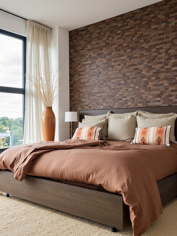 A woodland-inspired brown accent wall transforms a bedroom into a cozy natural retreat by bringing the outdoors inside. Using rich earth tones and organic textures, this focal point creates a soothing atmosphere that promotes relaxation and connection with nature.