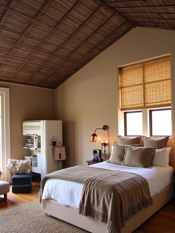 Brown woven bamboo ceilings offer a sustainable and elegant alternative to traditional ceiling materials, bringing natural warmth to bedroom spaces. These ceilings provide excellent insulation and acoustic benefits while creating a peaceful atmosphere through their unique textural elements.