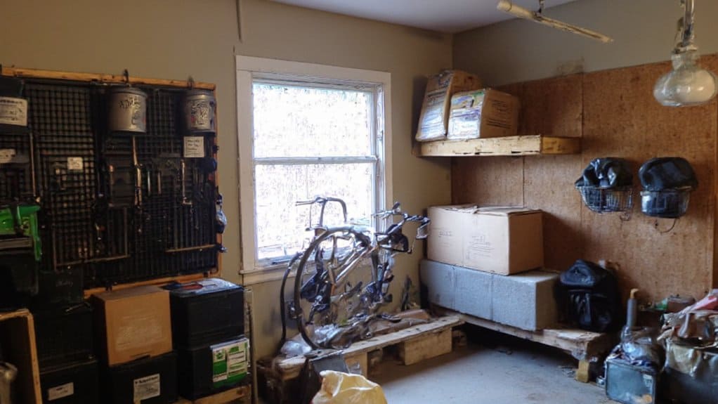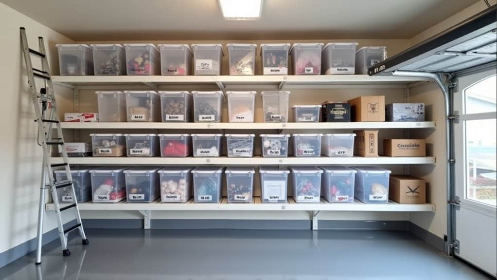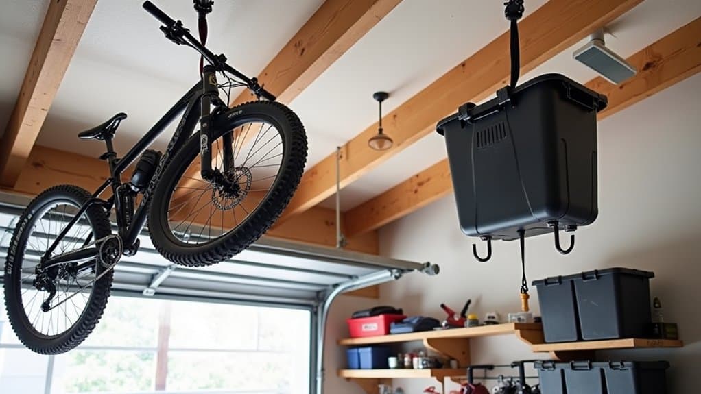 Installing ceiling hooks in your garage is a fantastic way to maximize storage space, especially for items that are infrequently used or seasonal. Start by identifying a sturdy area on your garage ceiling, such as a joist, to guarantee the hooks can support the weight of the items you plan to hang. Use a stud finder to locate these strong points, then securely install heavy-duty ceiling hooks with appropriate hardware, confirming they are rated for the load.