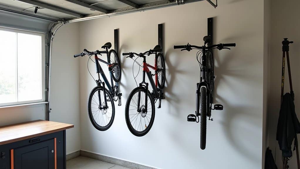 Choose a vertical bike rack system that suits your needs, whether it’s a wall-mounted hook, a pulley system for ceiling storage, or a freestanding rack that holds multiple bikes. Install the rack securely, following manufacturer instructions, and use sturdy hardware to guarantee safety and stability. Regularly check the bikes and rack for any signs of wear or damage to prevent accidents and maintain an organized garage space.