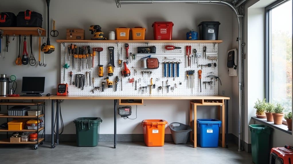 Stackable plastic bins are a versatile and efficient way to organize a garage, providing a solution for storing a wide range of items like tools, seasonal decorations, and sports equipment. Choose clear bins to easily see the contents without needing to open them, or opt for labeled, colored bins to categorize items by type or frequency of use. Make certain the bins are durable and have secure lids to protect contents from dust and moisture, creating a tidy and accessible storage system.