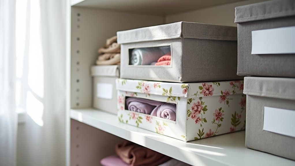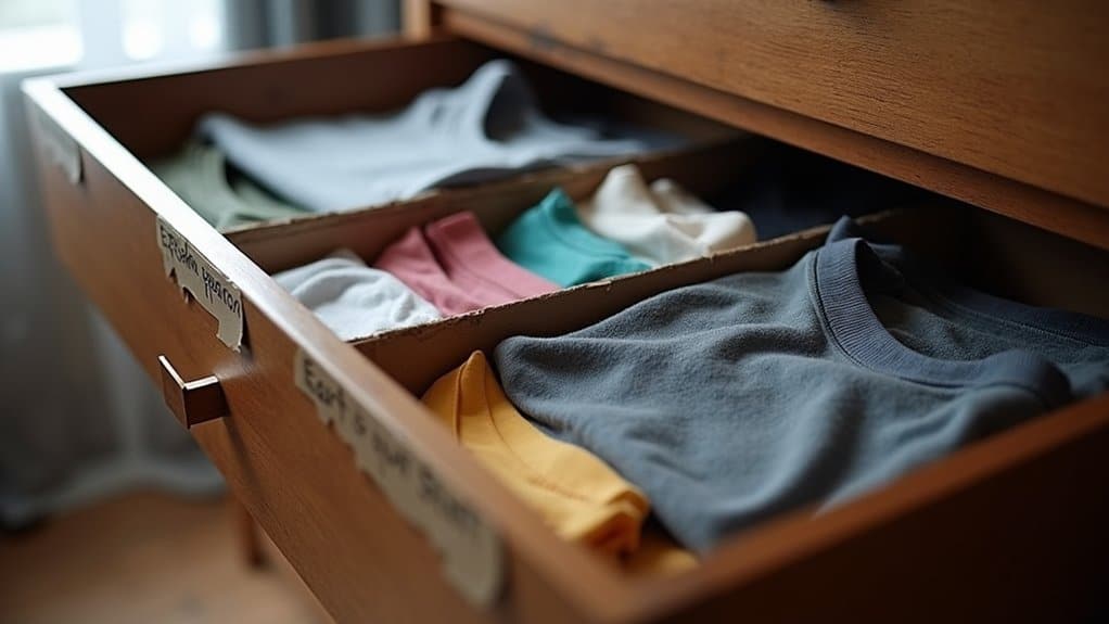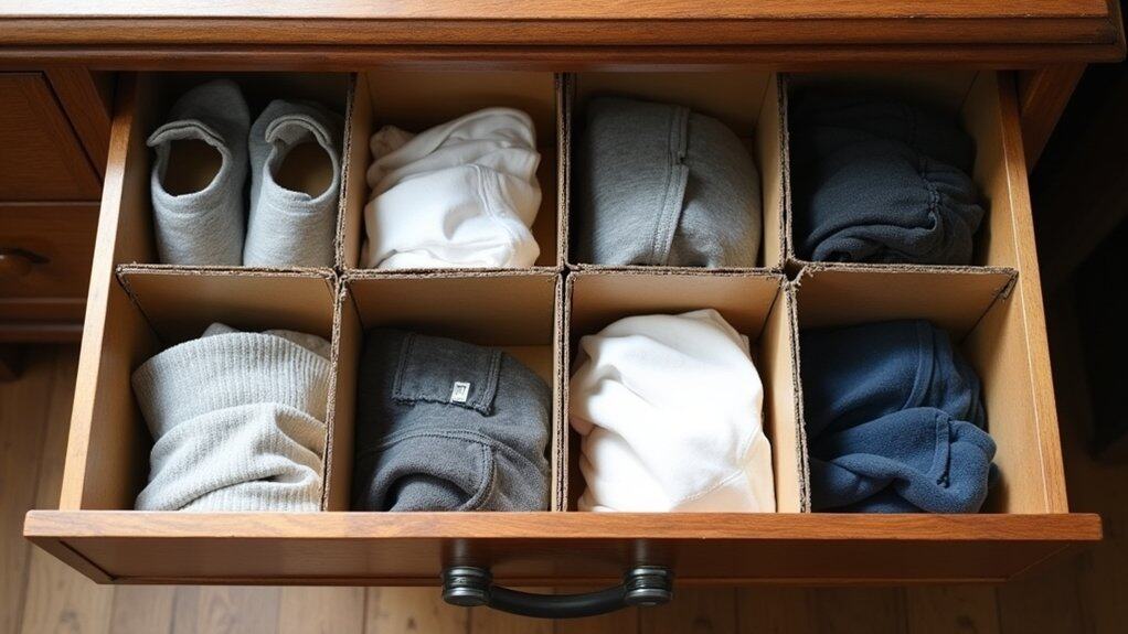 To assemble, secure the DIY dividers with tape or glue for added stability, ensuring they stand upright and maintain their shape under the weight of your items. Label each section with small tags or stickers for quick identification, making it easier to find what you need without creating a mess. This simple hack not only maximizes space but also brings a personalized touch to your wardrobe organization without breaking the bank.